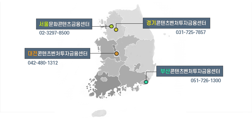 | 대전콘텐츠벤처투자금융센터 | 대전광역시, 충청북도, 충청남도, 세종특별자치시, 광주광역시, 전북특별자치도, 전라남도, 제주특별자치도 |